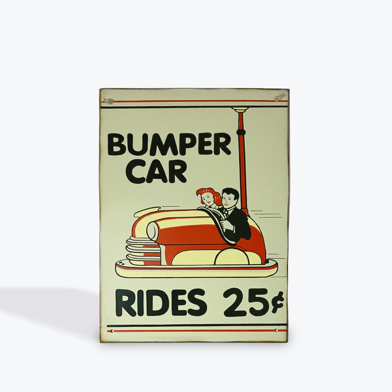 遊園地でおなじみのバンパーカー!そのクラシックなイラストが可愛いビンテージ加工(サビや汚れを付け加工)されたアメリカンブリキ看板です。